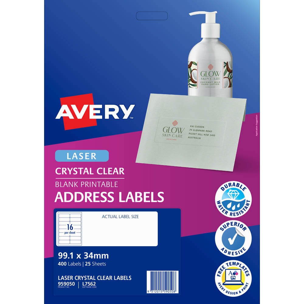 AVERY CRYSTAL CLEAR LASER ADDRESS LABELS WHITE L7562 99.1X34MM 16UP 400 LABELS
