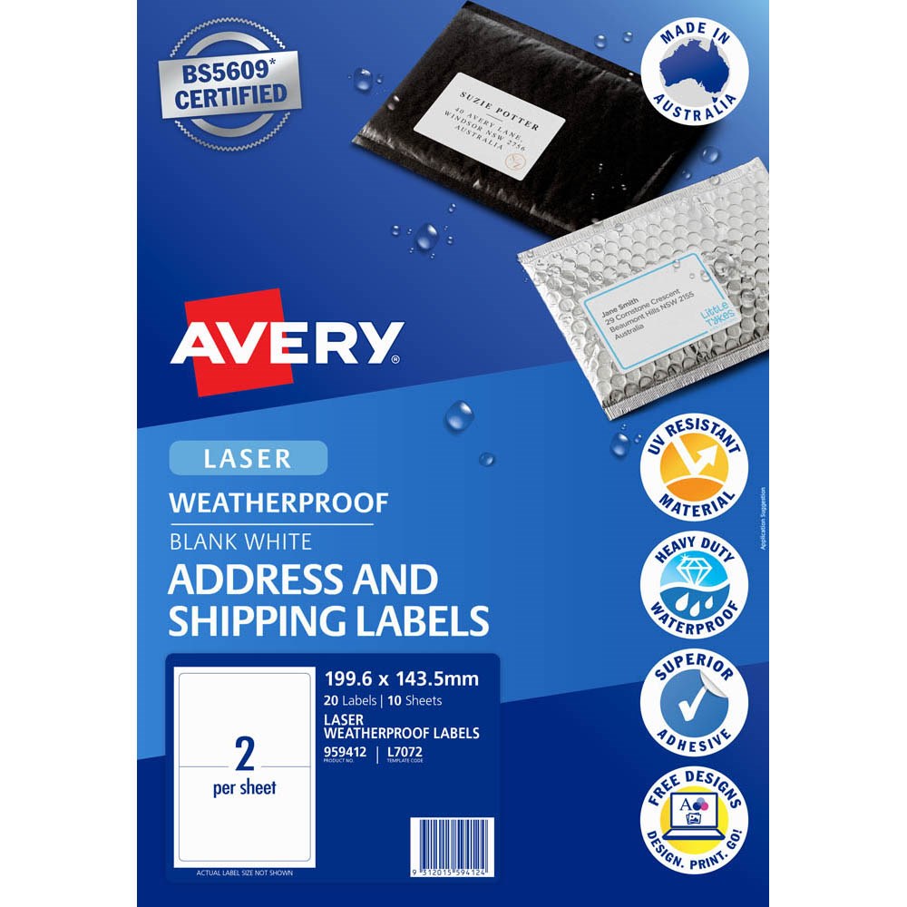 AVERY WEATHERPROOF ADDRESS & SHIPPING LASER WHITE L7072 199.6 X 143.5MM 2UP 20 LABELS