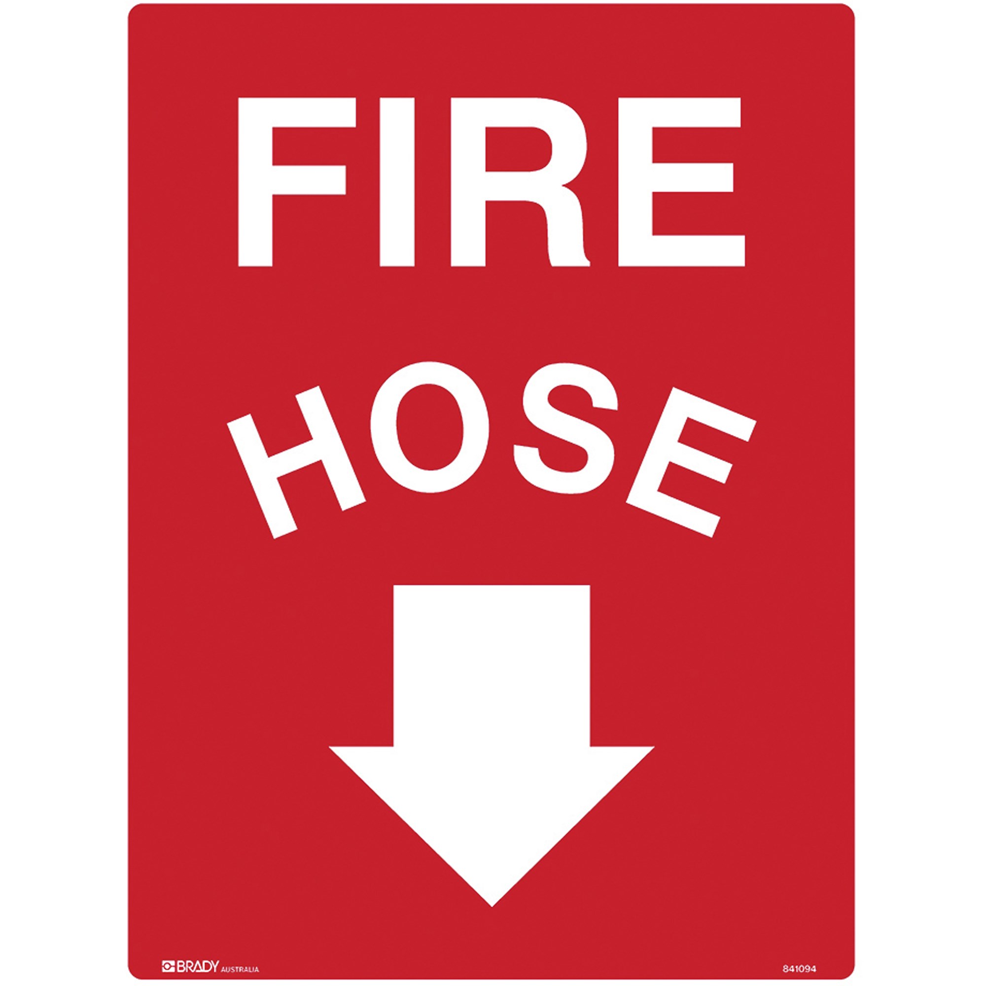 BRADY FIRE SIGN FIRE HOSE WITH ARROW DOWN 450W X 600MMH POLYPROPYLENE WHITE/RED