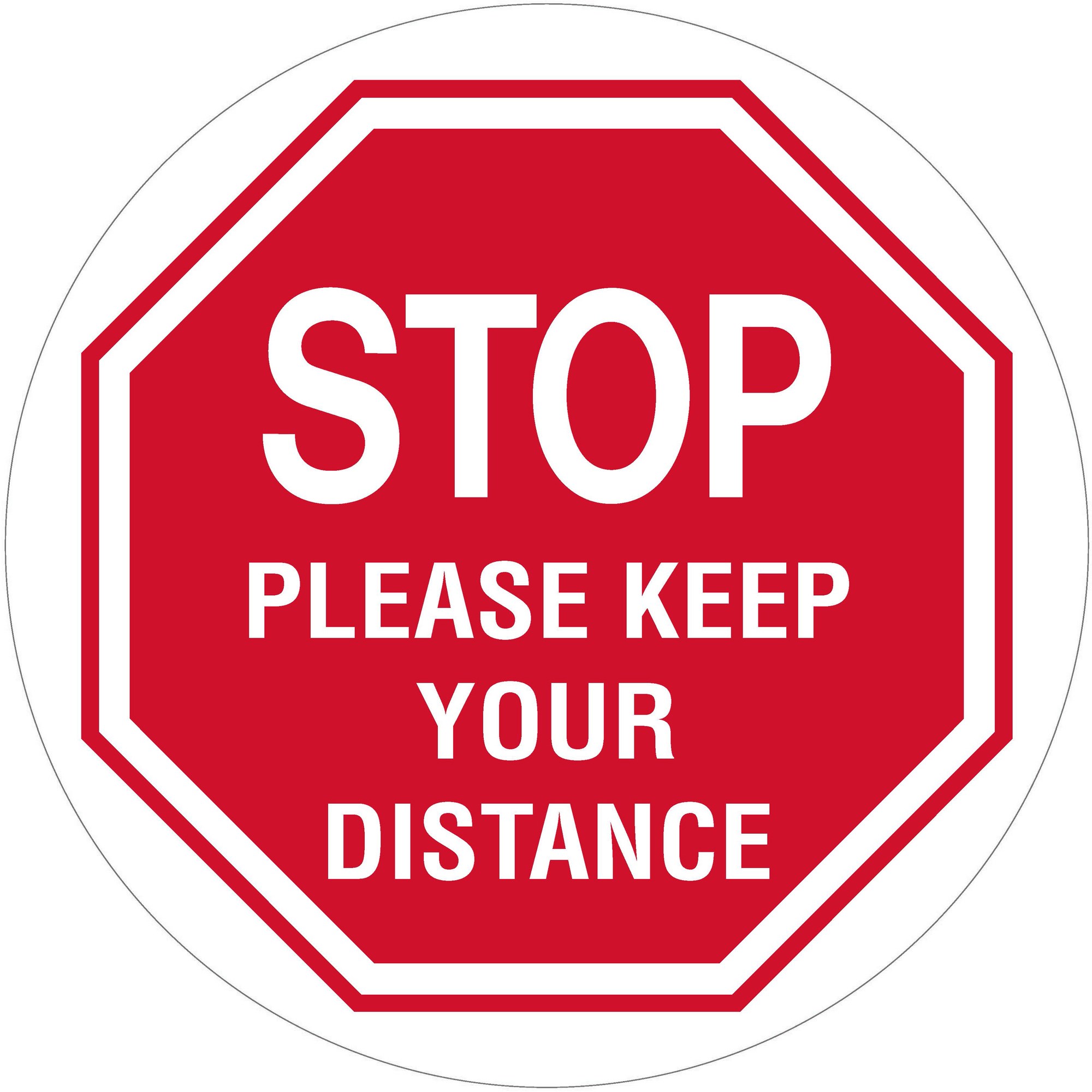 Wording: Stop Please Keep Your Distance. Self-adhesive walk-on floor sign designed to bond to many different surfaces. Clear textured overlaminate protects warning message. Suitable for heavy traffic areas or wall mounting applications where graffiti or heavy wash downs are a problem. Size:440mm Diameter. Suitable for internal use. Size: 440mm diameter.