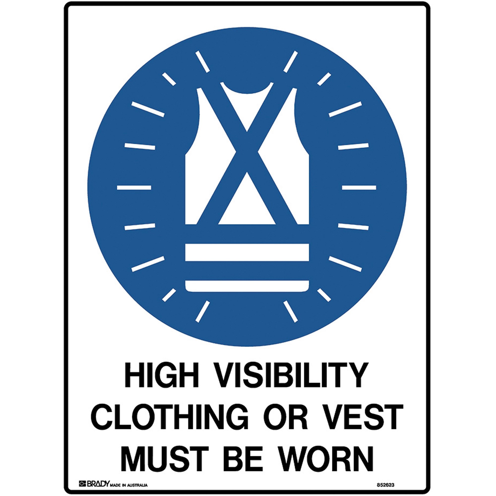 Wording: High Visibility Clothing Or Vest Must Be Worn. Material: Metal. Mandatory signs specify an instruction that must be carried out. Complies with AS 1319. Available in various materials and sizes. Size: 450W x 600mmH.