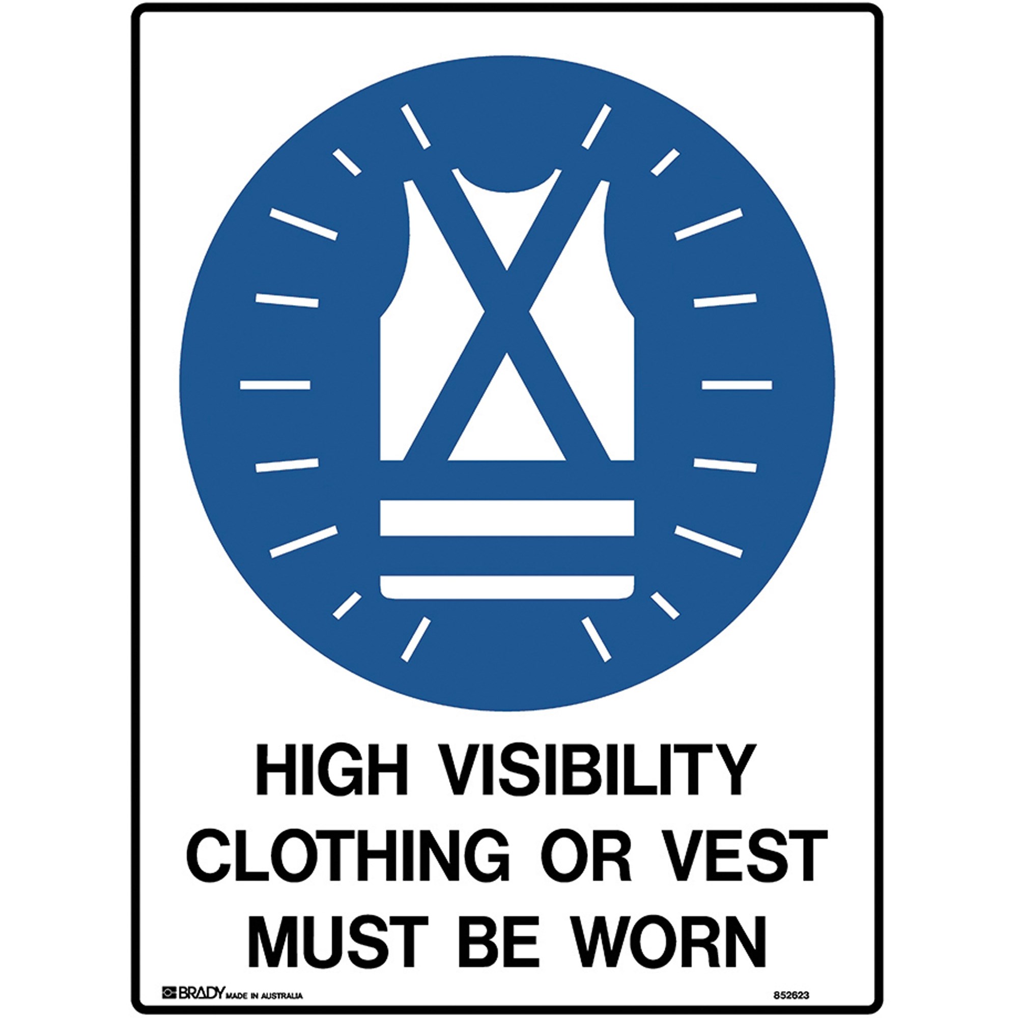 Wording: High Visibility Clothing Or Vest Must Be Worn. Material: Polypropylene. Mandatory signs specify an instruction that must be carried out. Complies with AS 1319. Available in various materials and sizes. Size: 450W x 600mmH.