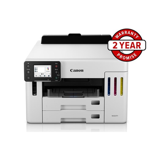 Single function colour inkjet printer. Ideal for small offices. Printing yields of up to 6,000 black and white A4 prints and up to 14,000 colour prints per set of ink bottles, reducing the need to think about replacing your printer's ink as frequently. Document Print Speed: 15ipm (colour) 24ipm (black and white). Paper Capacity: 250 sheets for the upper and lower trays and 100 sheet rear feed. Connectivity: Wired LAN, Wireless LAN 2.4GHz & 5GHz, Direct Connection (Wireless LAN). Display: 2.7 inch touch colour LCD. Wireless connectivity for wireless printing, and mobile printing via the Canon PRINT app. Compatible Ink: GI-66 ink series. Maintenance Cartridge: MC-G01. Dimensions: 399W x 410D x 298mmH. 2 Year Manufacturer's Warranty.