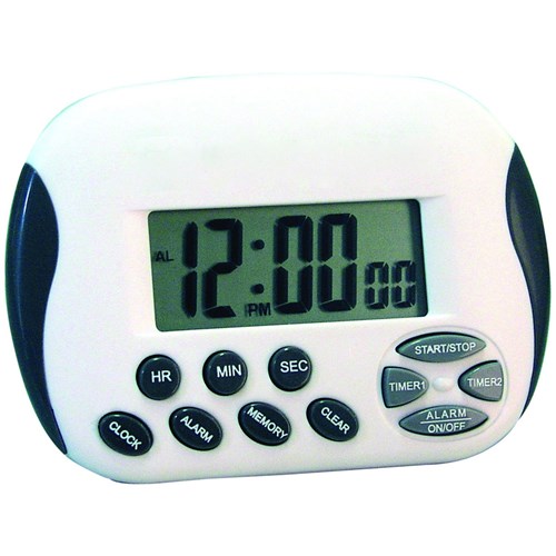 Clock function with am and pm identification. Time function can be easily set on/off. Uses 1x AAA battery (not included). Two timers allowing you to time 2 things simultaneously Timers are count up or count down with 1 minute \"times up\" beeping sound. Memory function. Hour, minute and seconds buttons for timer setting. Able to self stand, hang, clip and has a magnet. 1 Year Manufacturer's Warranty.