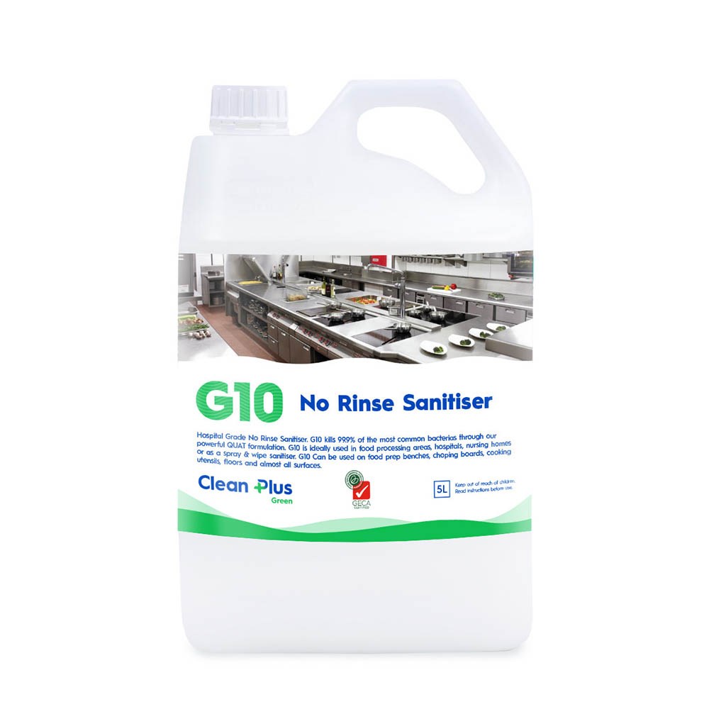 Hospital grade, no rinse sanitiser. G10 kills 99.9% of the most common bacteria through our powerful quat formulation. GECA approved product biodegradable safe to be used on food preparation areas when used according to instructions provided. It is ideally used in food processing areas, hospitals, nursing homes or as a spray & wipe sanitiser. G10 Can be used on food prep benches, chopping boards, cooking utensils, floors and almost all surfaces.