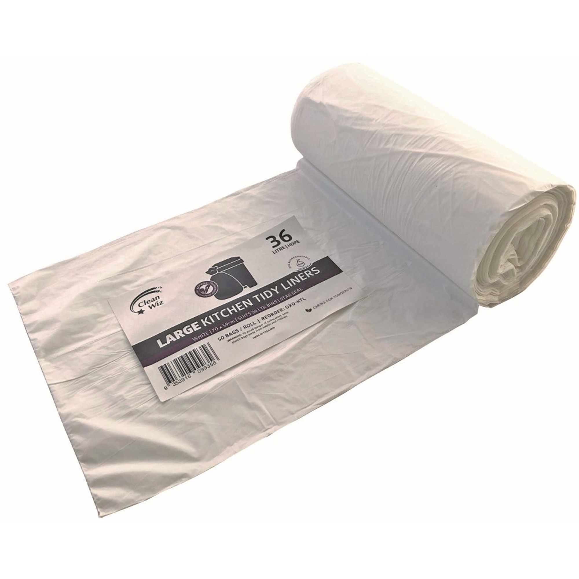 CLEAN WIZ OXO-BIODEGRADABLE KITCHEN TIDY LINERS 36 LITRES WHITE ROLL OF 50