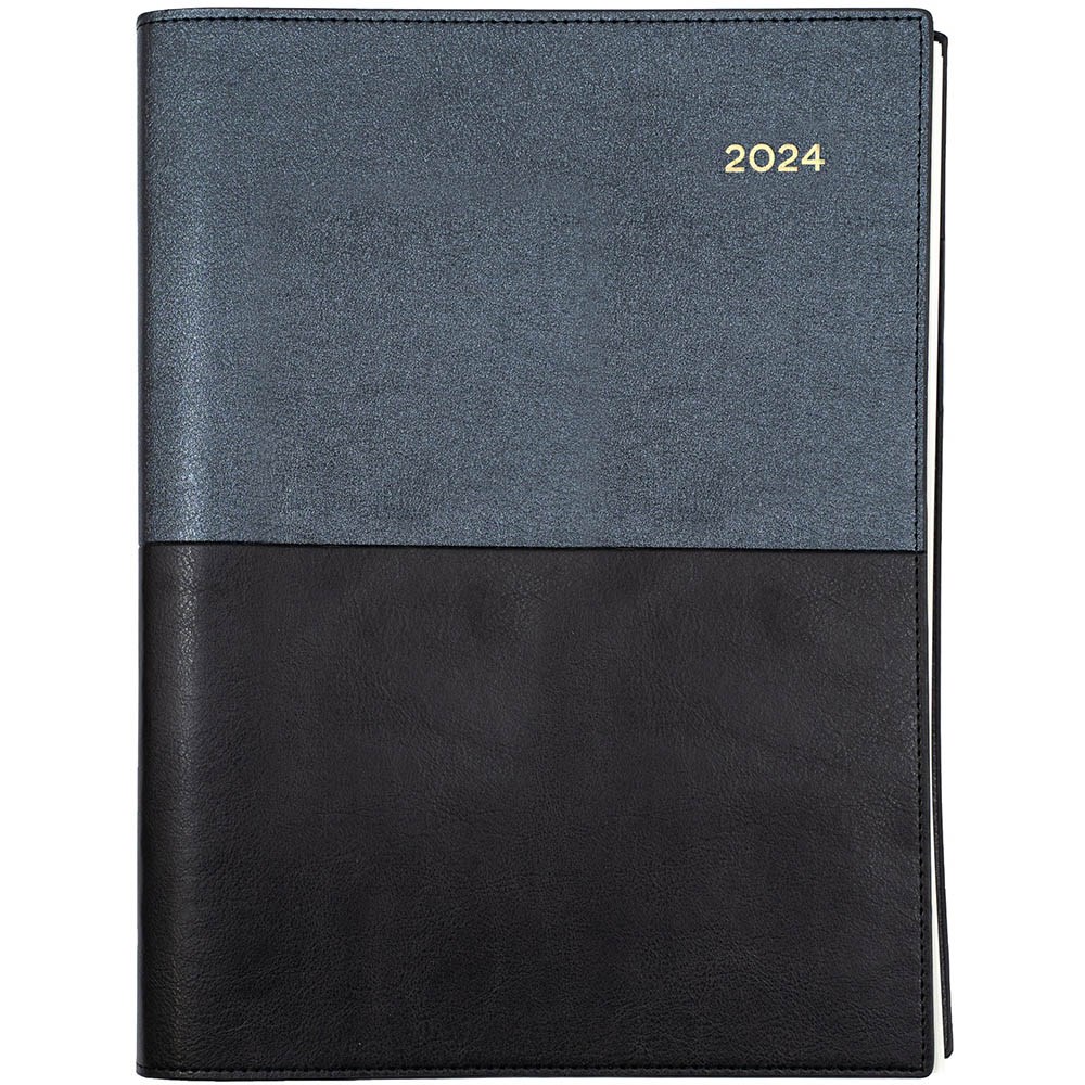 The best selling Vanessa Diary is the diary of choice for astute professionals. Its durability is assured with double wire binding and heavy-grained metallic and matt PU cover. Printed on a subtle cream paper, each dated page layout features a six-month to opening calendar, week numbers, Julian days, as well as both national and international public holidays. Internal storage pocket, addresses and notes. Pen loop, lay flat opening, ribbon marker, day to page layout. Appointment times from 8am - 6pm 1/2 hourly. Staff leave and financial summary. 3 Year calendars, Current and forward year planners. International dialling and time zone map. Size: 297 x 210mm. FSC Certified.