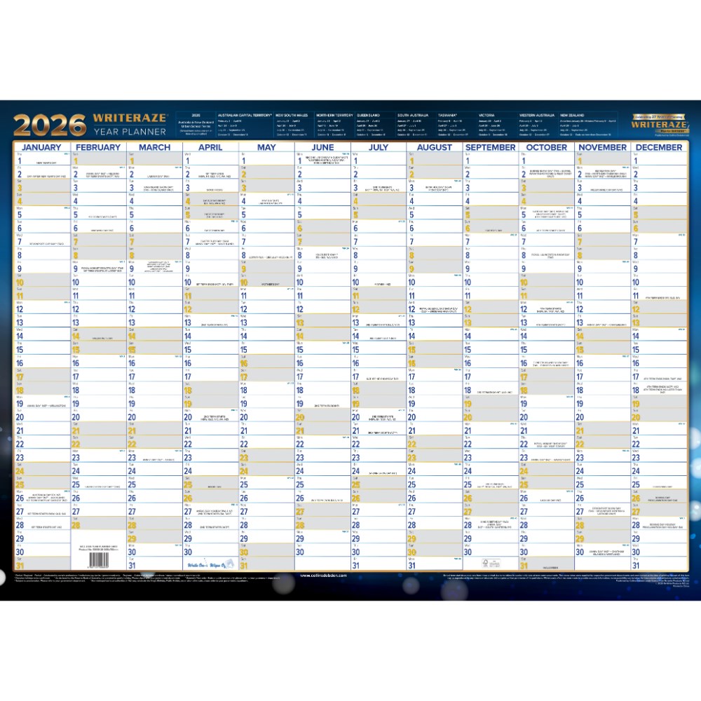 Laminated planner for write on/wipe off applications, supplied with quality dry erase marker, marker clip and adhesive mounting blocks. Includes all Australian holidays and important dates, with shaded weekends for easy weekly planning. Size: 500 x 700mm. FSC Certified.