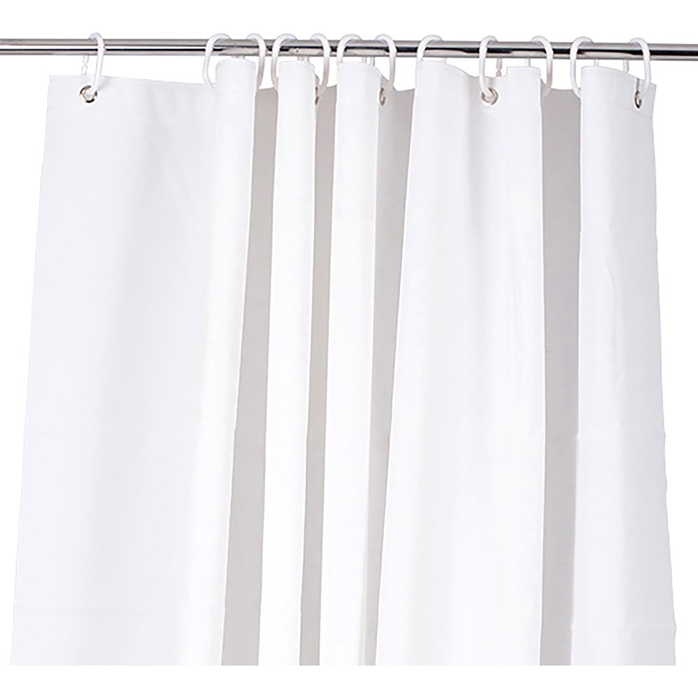 PEVA non-chlorinated vinyl material. 12 plastic rings included for 12 eyelets. Plain finish (no pattern on material). Water resistant and water repellent. Light weighted base. Warm machine washable, remove rings. Rinse well, line dry in shade recommended. Cleaning with strong cleaning chemicals not recommended. Dimensions: 1800W x 1800mmH.