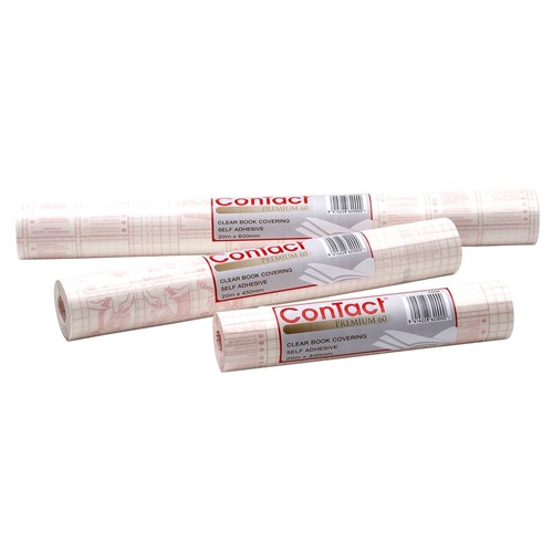 Contact is the premium standard for all book covering needs. Made from high quality clear gloss polypropylene. Non ageing water based repositionable permanent adhesive. Available in 300mm, 375mm, 450mm, 600mm and 900mm widths. 20m lengths. Red grid backing paper with instructions.