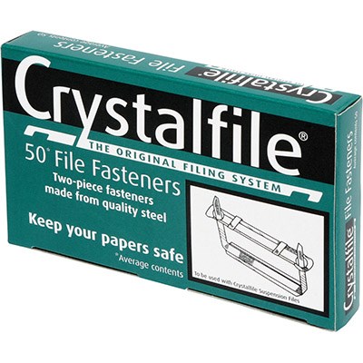 2 piece metal system with sliding mechanism which makes fastening action quick and easy. Suits standard 2-hole punched folder. 80mm centres with 50mm prong. Ideal for use with crystalfile suspension files. Made from quality steel.