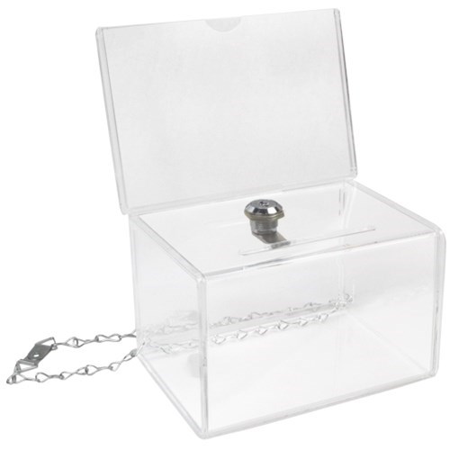DEFLECTO DONATION BOX LOCKABLE WITH A6 LANDSCAPE HEADER CARD CLEAR ACRYLIC