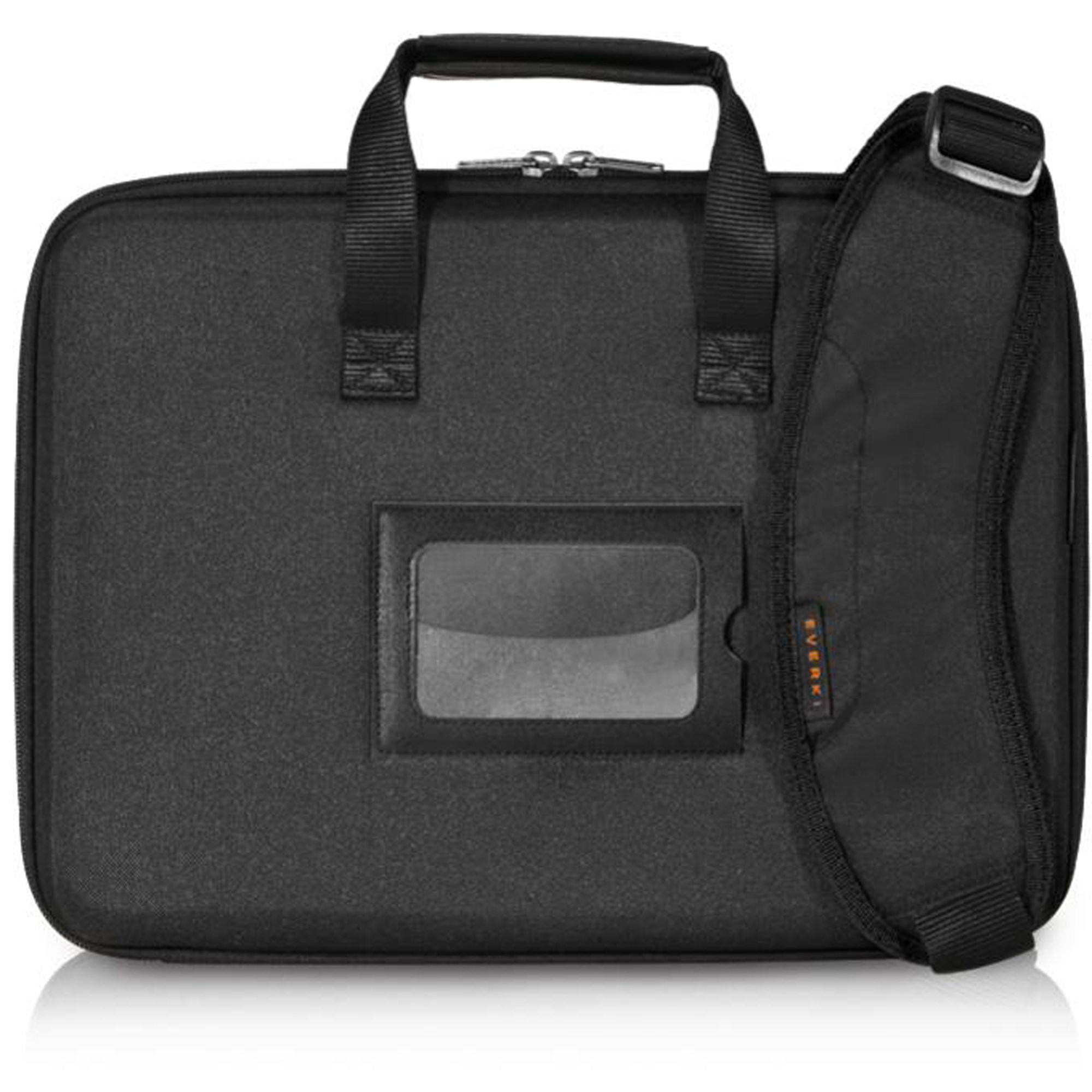 390mm x 280mm x 50mm. High Density Foam. Universal fitting straps and leather handles. Front name tag pocket. Includes shoulder strap. Backed by Everki Limited Lifetime Warranty.