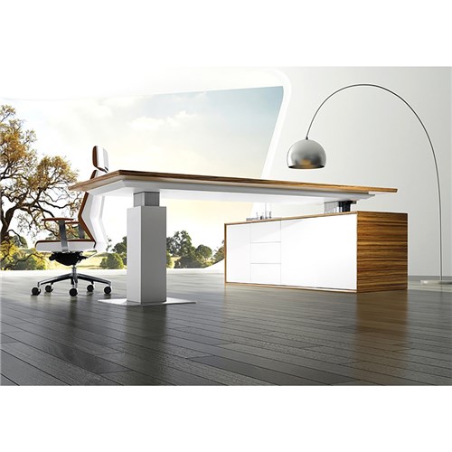 Top of the range executive workstation that is automatically height adjustable. Zebrano top with shark nose edging. Return buffet in white 2 pack paint. Return has 3 drawers and 3 doors. 3 Year Manufacturer's Warranty. Delivery, installation and assembly charges may apply to furniture. Please enquire to confirm.