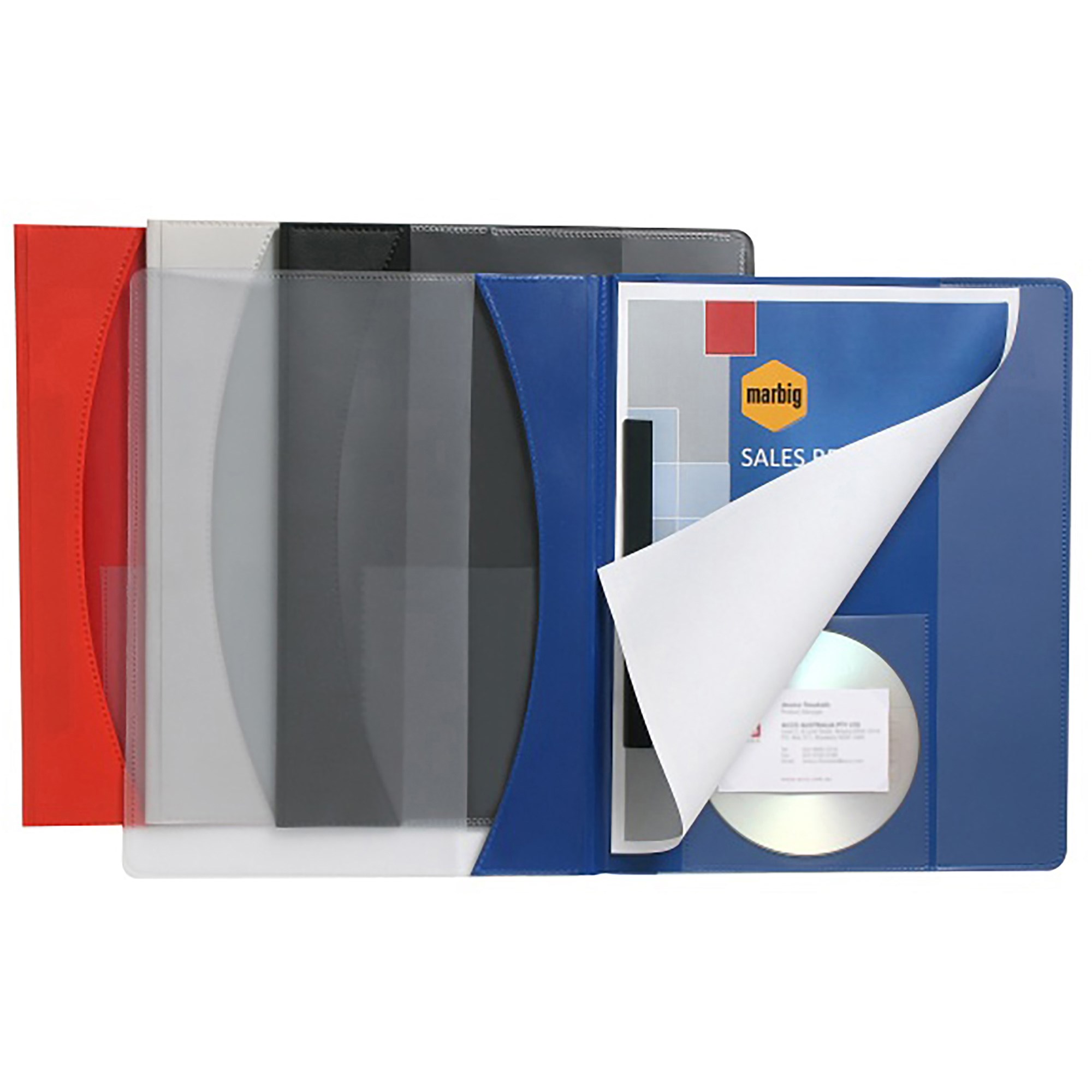 Insert pocket on clear front cover to personalise file. Includes slide bar and 2 prong fastener to secure pages and enhance appearance. Extra wide to cater for sheet protectors, indices and dividers. Includes a CD, business card holder and vertical pocket on the inside back cover. Simply punch papers and insert.