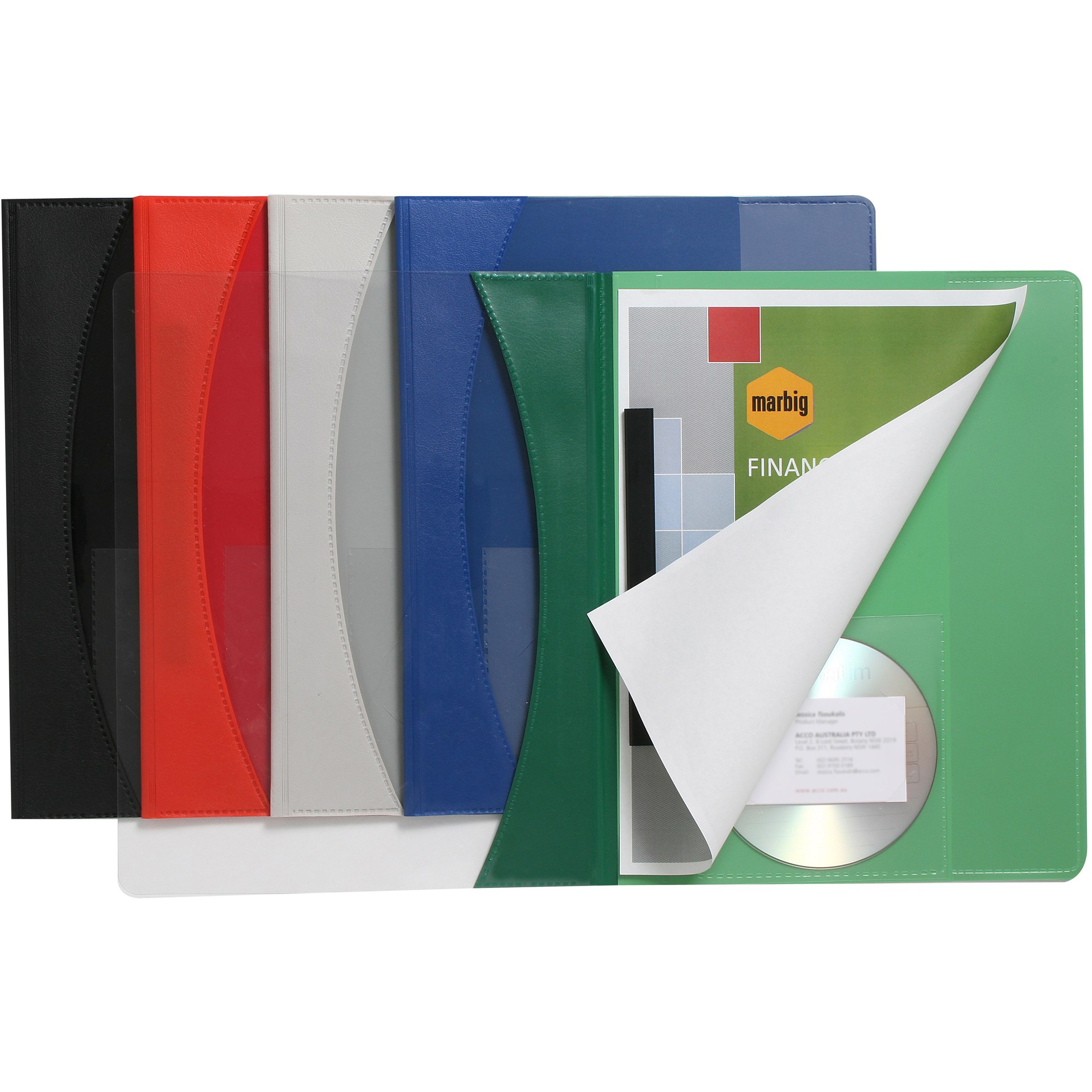 Semi-rigid A4 file with a clear front cover. Inside back cover with vertical pocket, CD holder and business card holder. Features 2 prong fastener to secure documents. Just punch your papers and insert. This allows you to edit your report easily and quickly. Includes a slide bar over the 2 prong fastener to secure contents and enhance appearance. Simply punch up to 40 pages and insert.