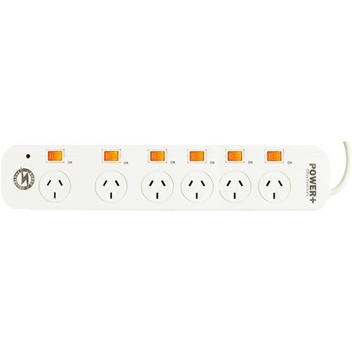 Powerboard with individual switches, surge and overload protection. Indictor light. Reset switch. 6 Outlet Power Board complete with 1 metre lead. 220-240V, 10A, 2400W (Max).