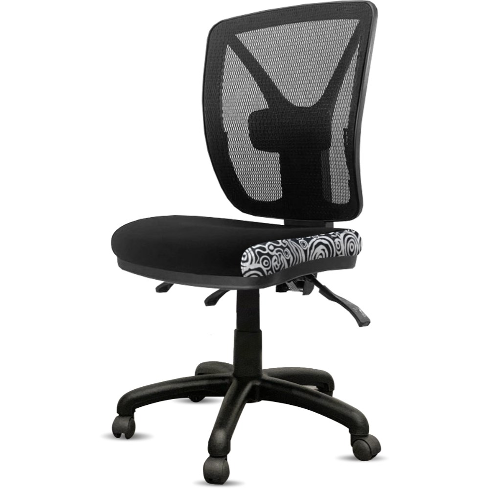 A unique commercial fabrics designed by Nelly Patterson (Indigenous Artist) combined with K2 Black Fabric to upholster the chair. Weight rating: AFRDI Rated Load 160kg Approved. Indicated seat hours: 24/7. Seat Dimensions: 510W x 490D x 460-590mmH. Back Height: 575mm. Back Width: 485mm. Heavy duty commercial chair with 3 lever mechanism and ratchet back height adjustment. 5 way 700mm commercial grade nylon base. Heavy duty gas lift cylinder. Korean mesh back. Therapeutic posture correct lumbar support. Moulded seat foam for supreme comfort. Fire retardant contoured moulded foam. Product image for reference only. Design pattern may differ as a result of variations in the art work. 10 Year Years Manufacturer's Warranty. Delivery, installation and assembly charges may apply to furniture. Please enquire to confirm. Optional adjustable armrest available. Refer to product code 3043352.