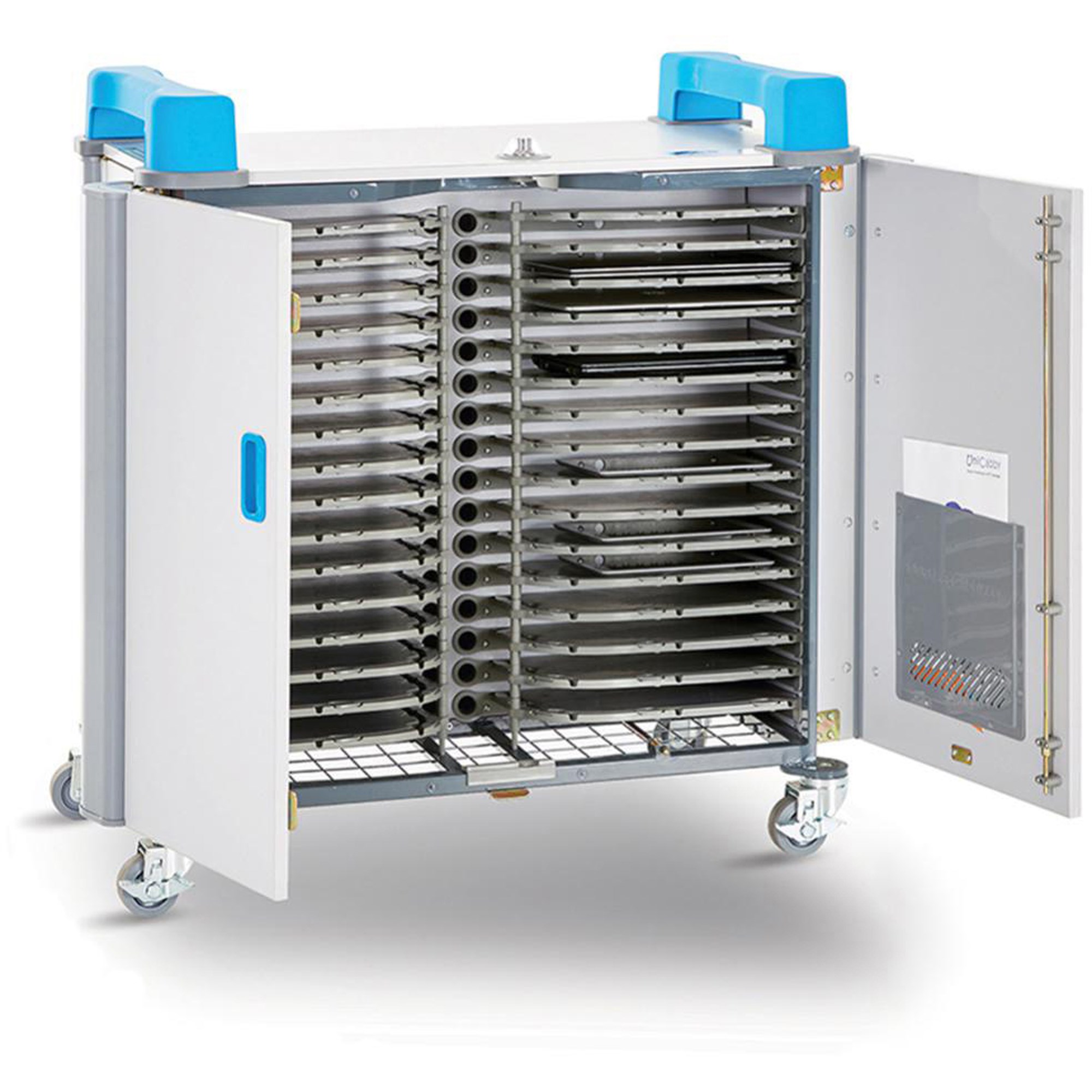 Charges 32 devices up to 14 Inch screen size. Device adaptors plug into 4 x 8-way power strips designed and manufactured in-house. Sockets accommodate larger adaptors and plugs without blocking adjacent outlets. Specially designed device shelf includes cleverly integrated cable channel and 5 flush mounted cable clips to ensure cables stay in place and free from damage. Fitted with large all directional swivel, non-marking hospital grade rubber wheels (2 braked). Thick steel binding plate connects heavy duty wheels to the cart ensuring wheels never buckle or loosen. Built-in heat sensor will shut off power if a device overheats or if interior temperature reaches 32C/90F degrees to prevent risk of fire or damage to devices. Silent ventilation system includes side and rear vents plus a uniquely designed weld mesh base to keep devices cool with constant air circulation without the need for a noisy fan that can spread germs. Power7 Management system preset for 3 daily charging schedules on weekdays with no charging schedules set for weekends, instructions supplied to amend charging schedule easily. Lifetime Warranty (5 years Electrical).