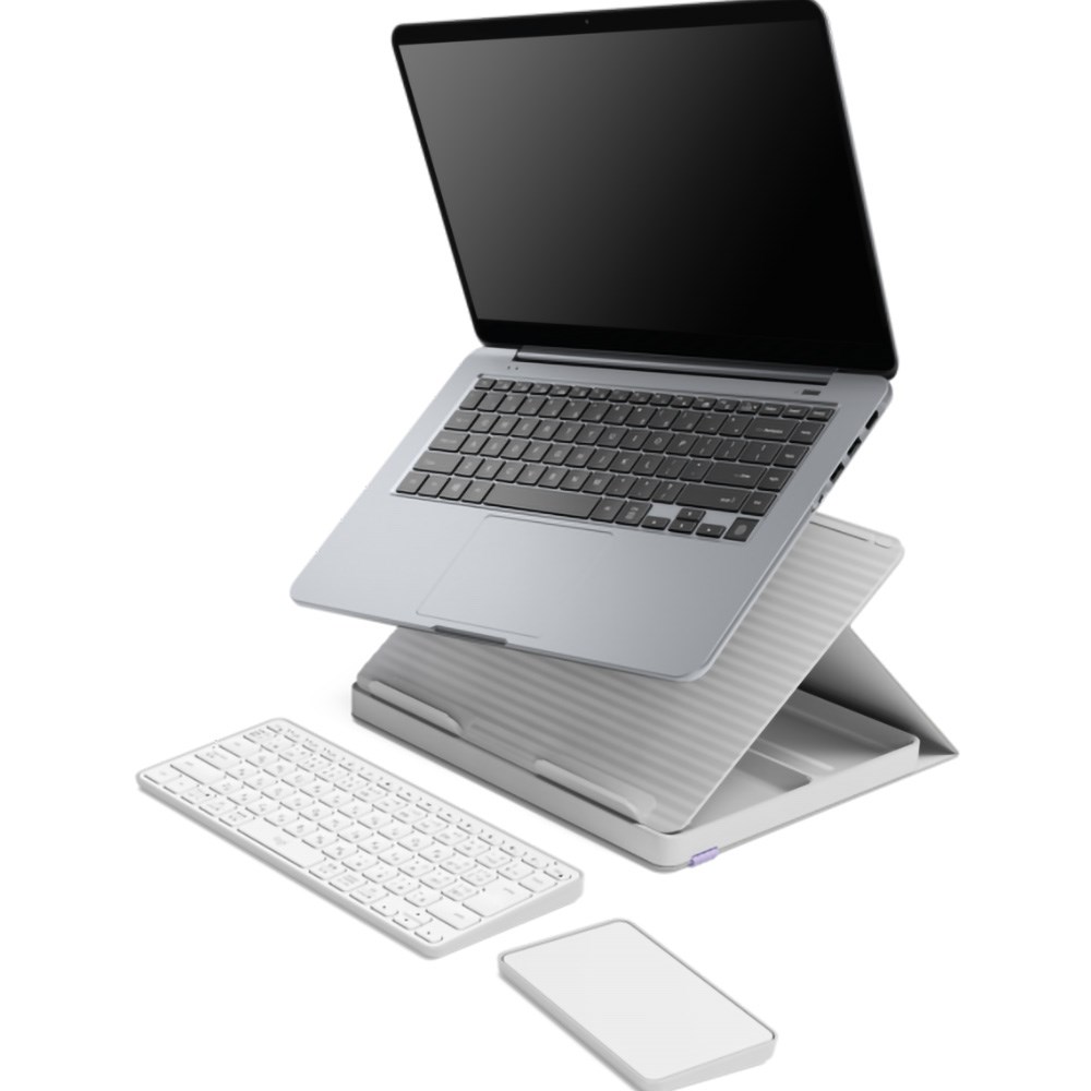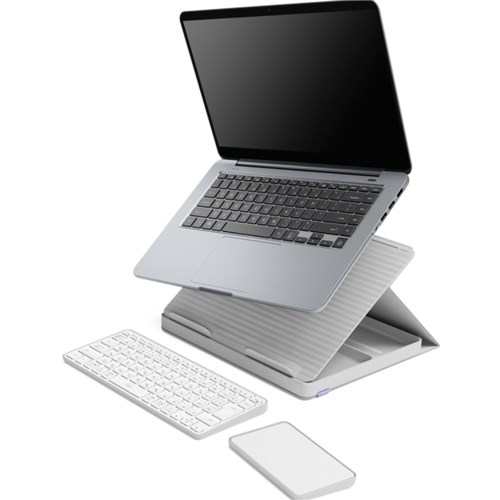Foldaway kit with laptop stand, keyboard, touchpad and storage. One compact kit with a wireless keyboard, wireless touchpad and a book-like case that transforms into a laptop stand. Ergonomic. Suitable for laptops from 10 inches to 17 inches and supports up to 7.5kg. Minimalist wireless keyboard and smooth wireless touchpad. Battery lasts respectively up to 5 months and 3 weeks on a full charge and the conveniently placed charging ports means you can keep working as you power up. 1 Year Manufacturer's Warranty.