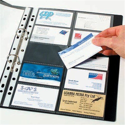 Conveniently stores, protects and secures business cards in your binder. Reinforced binding edge. Fits all standard 2, 3 and 4 ring binders. Inner edge opening securely holds cards. Holds up to 20 business cards per page. Binder not included. For Binder please see product 523492.