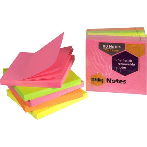 MARBIG REPOSITIONABLE NOTES 75 X 75MM BRILLIANT NEON 80 SHEET PAD ASSORTED PACK OF 5