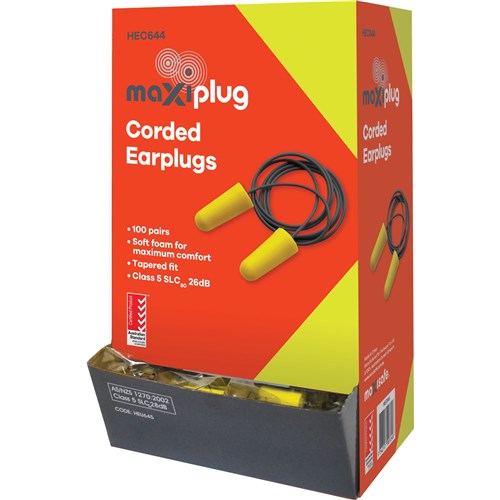 MAXISAFE MAXIPLUG EAR PLUGS DISPOSABLE CORDED 26DB YELLOW AND BLACK PACK OF 100 PAIRS