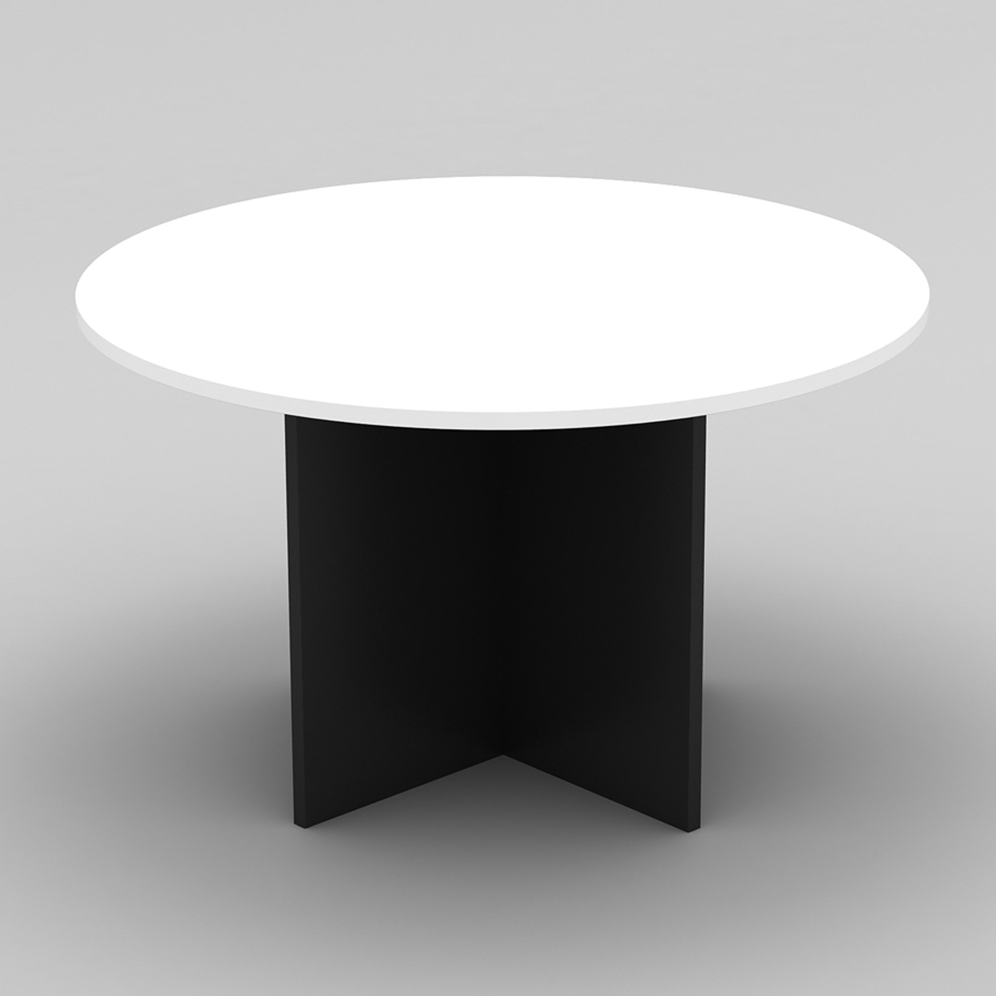 Round meeting table with stable cross base legs. Sturdy 25mm top over 25mm base. Comfortably seats 4 people. E1 grade melamine boards. 3 Year Manufacturer's Warranty. Delivery, installation and assembly charges may apply to furniture. Please enquire to confirm.