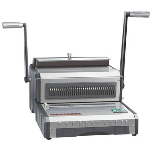 2:1 pitch wire. Punches up to 25 sheets. Binds up to 280 sheets. Accepts wires from 6 to 32mm. Wire closer has magnetic back to hold wire. Wire size selector for closing. Disengagable punches. Adjustable margins. Large waste drawer. Dimensions: 430 x 425 x 265mm. 2 Year Manufacturer Warranty.