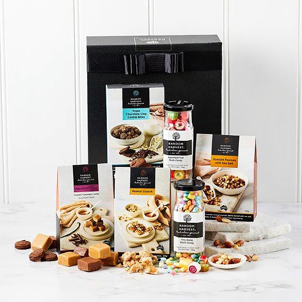 When it comes to Australian made confectionery, it doesn't get any more delicious than the Sweet Tooth Emporium Gift Hamper from Random Harvest. Each sweet treat is made in small artisan batches for the finest in quality each and every time. A premium confectionery range isn't available in supermarkets, making this sweet gift hamper even more special. 100% Australian made and backed by brilliant customer service and 100% Australian family owned business. The Sweet Tooth Emporium Gift Hamper Includes: Tiny Rocks 170g, assorted Fruit Rock 170g and assorted Fudge 125g. Peanut Crunch 125g, Triple Choc Cookies 100g and Roasted Peanuts with Sea Salt 120g. Presented in a gorgeous Hamper box. Stocked with 100% Australian gourmet sweets and cookies and will be enjoyed by everyone, young and old. A Random Harvest gift hamper will make the perfect corporate gift for your staff and clients.