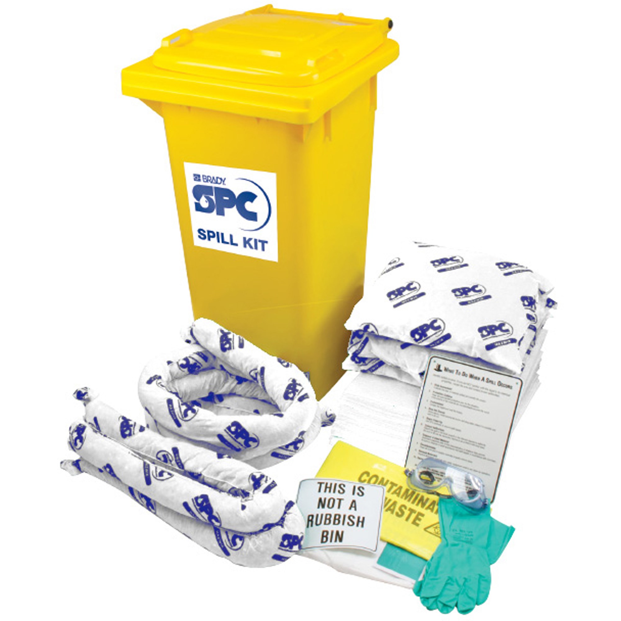 Complies to ISO 14001. Specifically designed for the clean-up of oils, fuels and other non-water, soluble liquids up to 120 litres. Will float on water (repels water). Comes in a handy weatherproof 120 litre bin. Portable emergency spill response solution for any facility. Kit contains: 3 socs (2 sizes), 50 pads, 3 pillows, 1 coveralls, 1 pair of gloves, 1 safety goggles, 3 disposal bags and 1 instructions for use. Refill packs available.