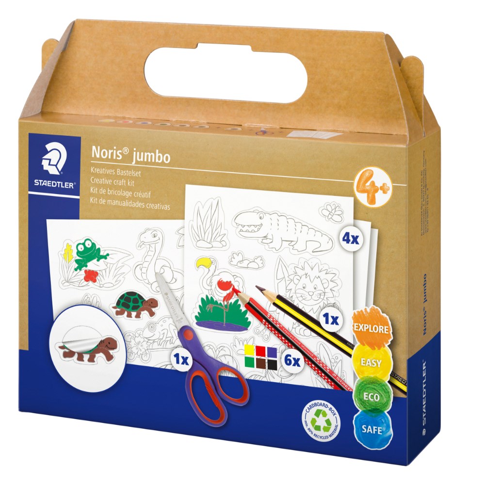 Set provides hours of colouring, playing and learning for children. Designed for children aged 4+ in mind. Suitable as a gift or travel companion for children thanks to practical suitcase packaging. 61 C3 contains: 4 x sticker sheets with wildlife figures, 6 x Noris jumbo colouring pencils, 1 x Noris graphite pencil, 1 x Noris crafting scissors.