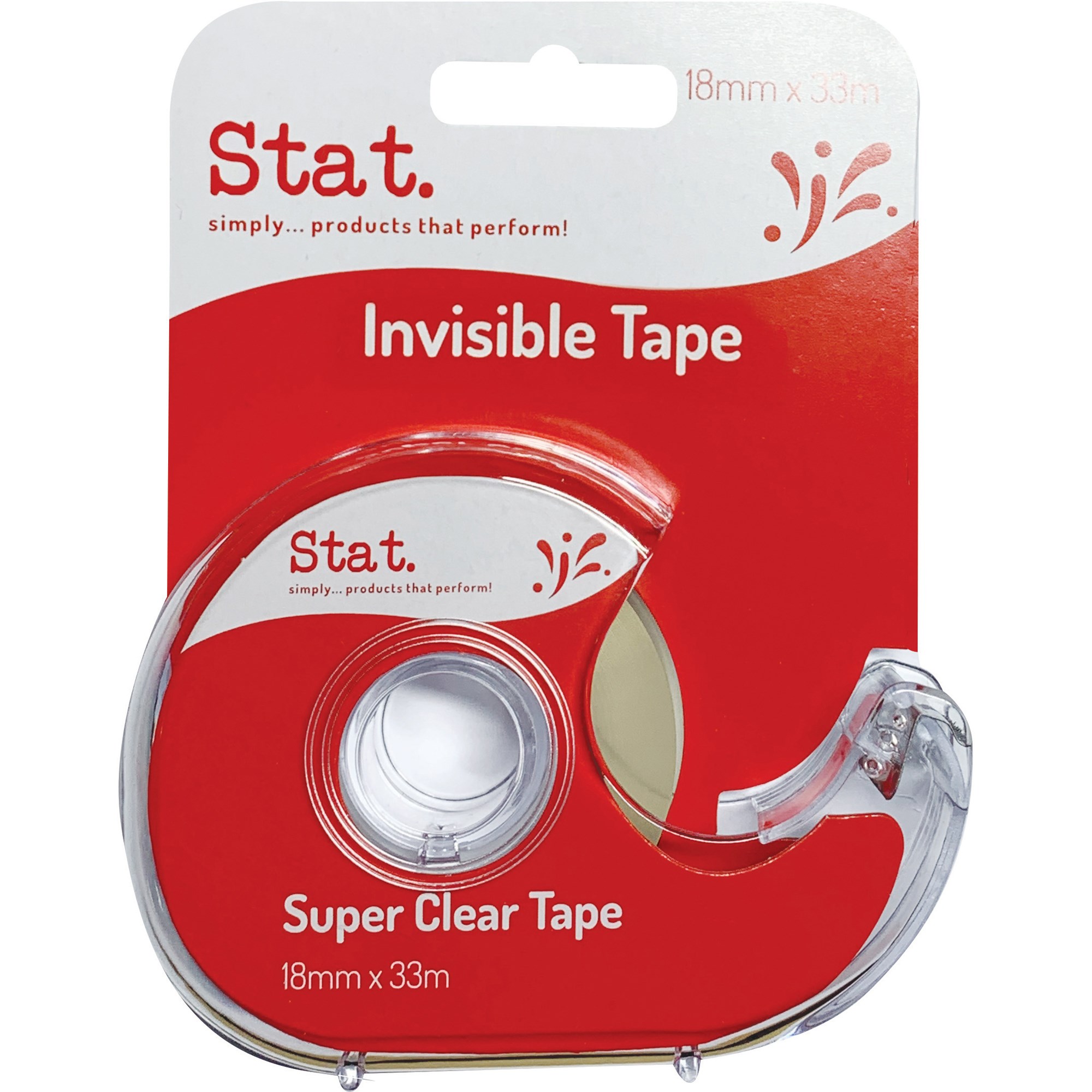 This Stat Invisible Tape Roll Measure 18mm X 33M And Blends Against Its Background, Making It Invisible, So It Will Not Detract From Your Work Or Project Ideal For Home, School And Office Environments This Easy To Tear Tape Is Perfect For Mending And Repairs, As Well As, Your General Purpose Sealing And Bonding Tasks It Unwinds Smoothly Off The Roll And Can Be Written On With Pens, Pencils And Markers This Tape Will Not Shadow When Photocopying And Faxing And Is Photo Safe Comes On A Handy Dispenser With A Serrated Blade For Easy Cutting And In A Convenient Hangsell Pack
