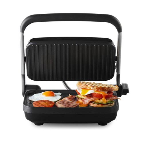 Multiple height adjustment and versatile top plate-lock. Fits 2 Sandwiches. Creates evenly browned toasties with beautifully melted cheese without any squishing or flattening. Heat-up and even heat distribution in just 2 minutes. The non-stick coating and the curved corners of the cooking plates make wiping up oil and crumbs effortless. Conveniently folds up for stand-up storage. Keep your cupboard neat with the built-in cord wrap hidden under the base. Dimensions: 335W x 280D x 110mmH. 2 Year Manufacturer's Warranty.