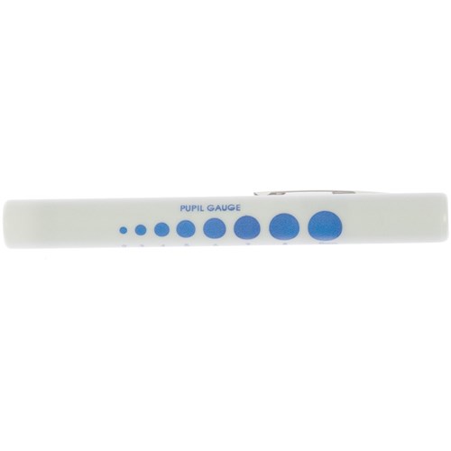 Disposable examination torch. Pen-shape design makes it easy to hold. Pupil size-guide printed on for easy reference.