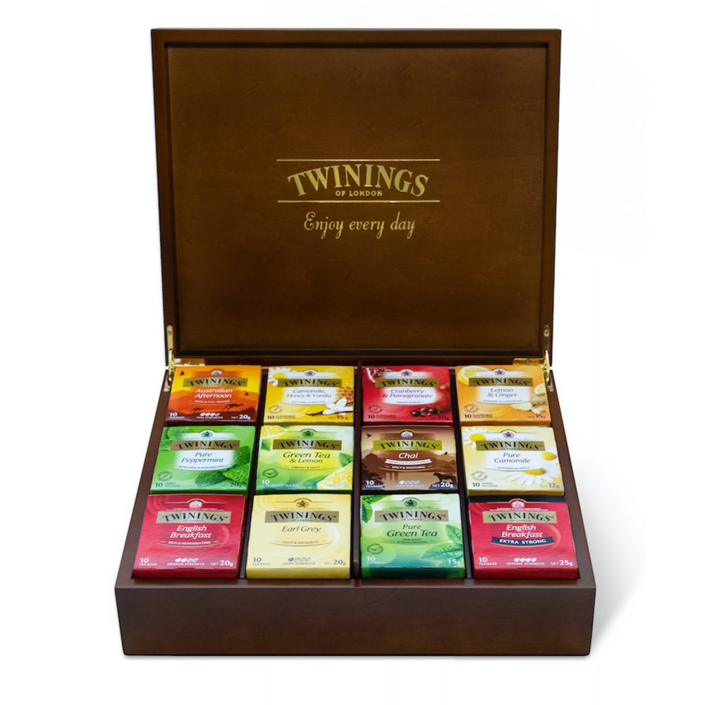 12 compartments contains a combination of teas in a uniquely crafted wooden box including: Green Tea and Lemon, Chai and Vanilla, Pure Camomile, English Breakfast, Earl Grey, Pure Green Tea, English Breakfast Extra Strong, Pure Peppermint, Lemon and Ginger, Cranberry and Pomegranate, Cammomile Honey and Vanilla and Australian Afternoon tea. Ideal for kitchens, boardrooms and staff rooms to stock up on teabags for events, functions, special occasions and work meetings.