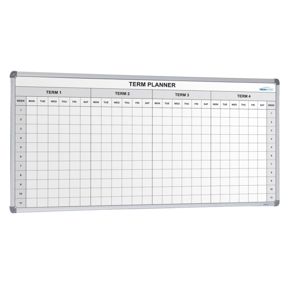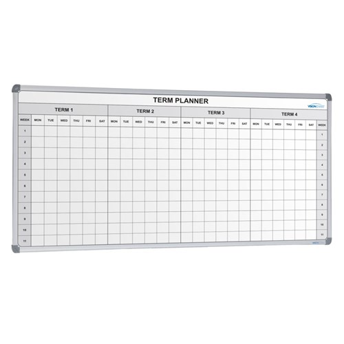 School Term Planner divided into 4 Terms and 11 weeks. 1 Year Surface Warranty. Supplied with Markers and Cleaning Cloth.