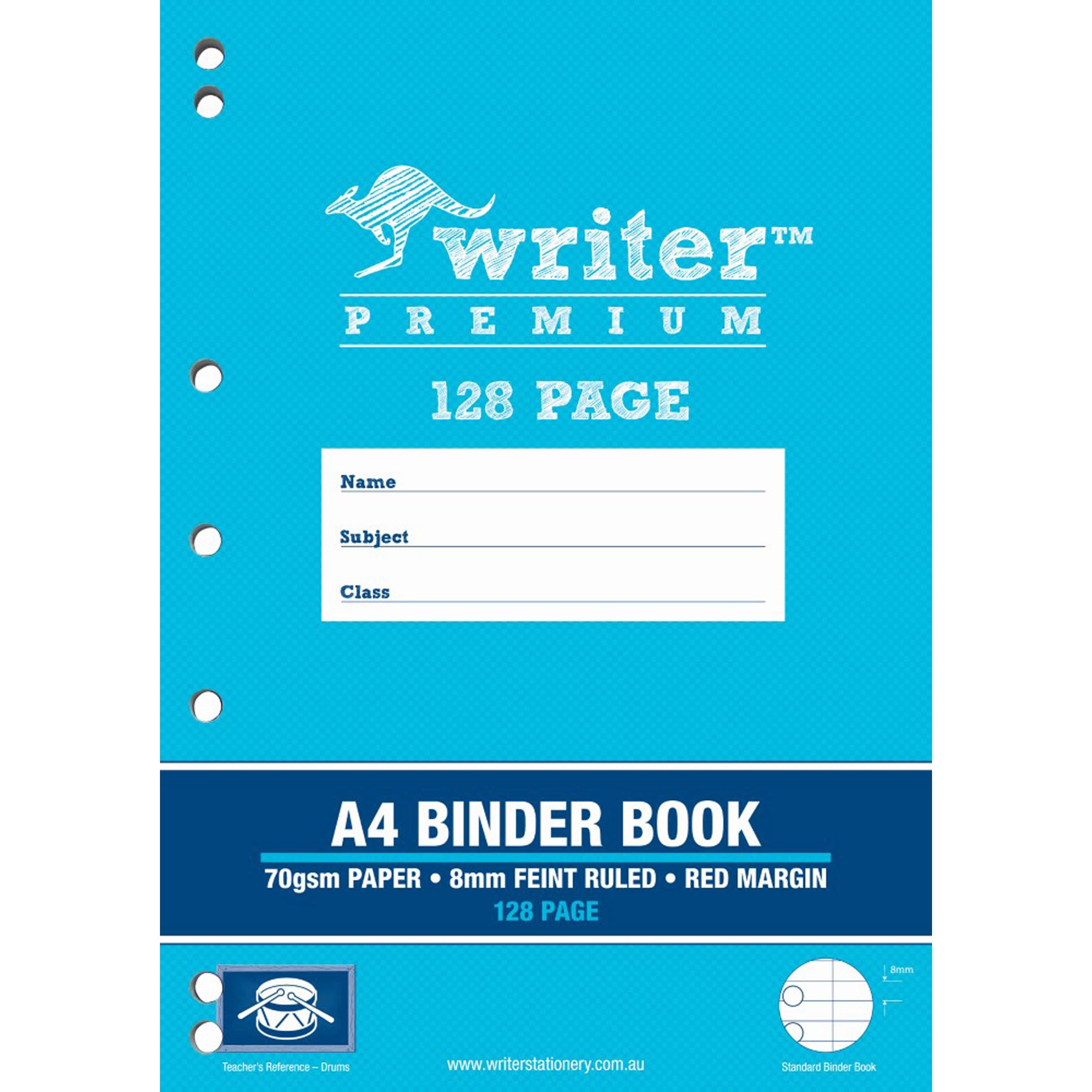 Writer Premium Binder Books feature heavy duty covers, high quality white 70gsm paper with blue ruled lines and a red margin 7 holes to suit ring binders Unique cover colours and teachers references make each book easy to recognize Writer Premium Exercise Books also include an activity page, maths tables and conversion charts The Premium choice for all your school work