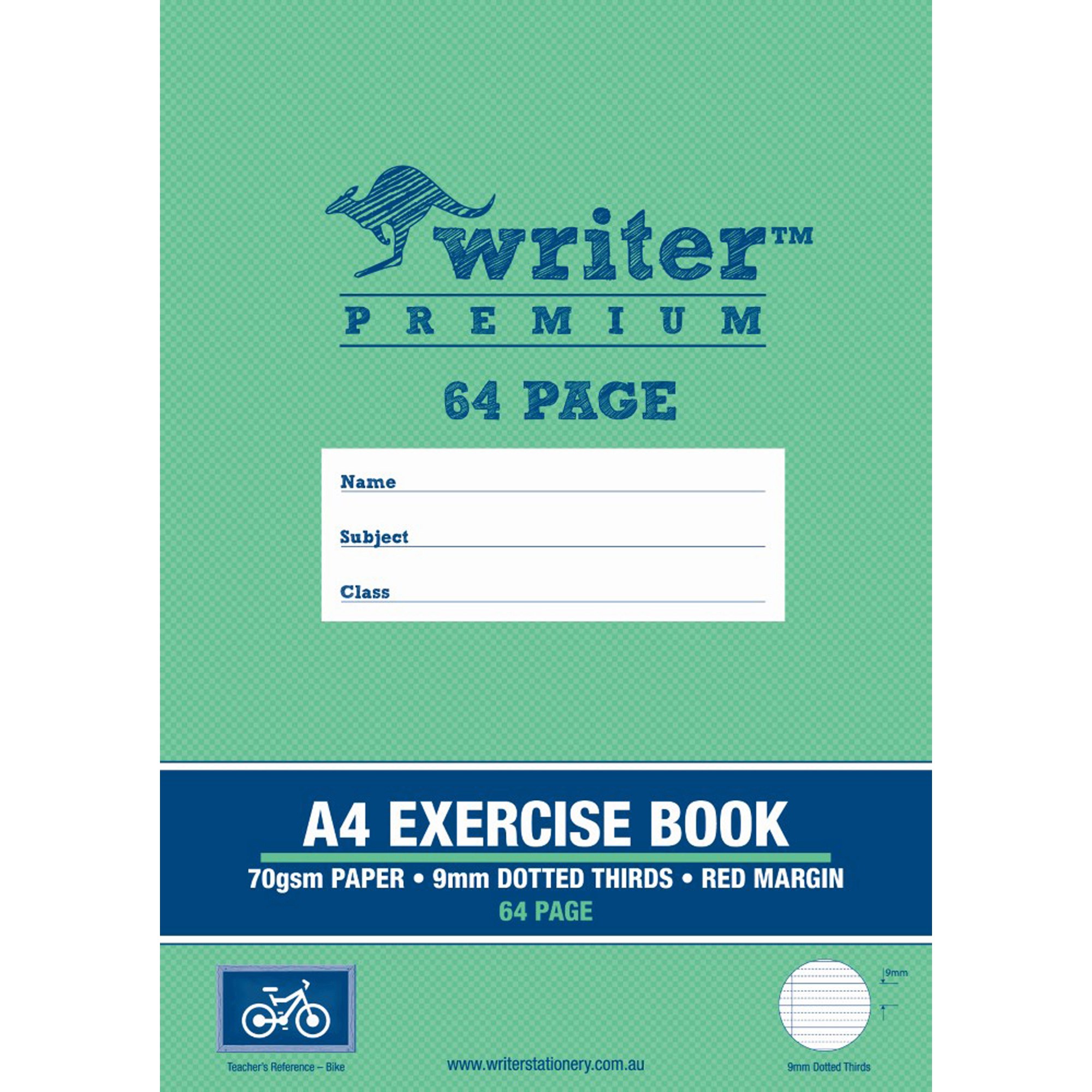 Writer Premium Exercise Books feature heavy duty covers, high quality white 70gsm paper with blue Dotted Thirds ruled lines and a red margin. Unique cover colours and teachers references make each book easy to recognize. Writer Premium Exercise Books also include an activity page, maths tables and conversion charts. The Premium choice for all your school work. Teachers reference is 'Bike'.