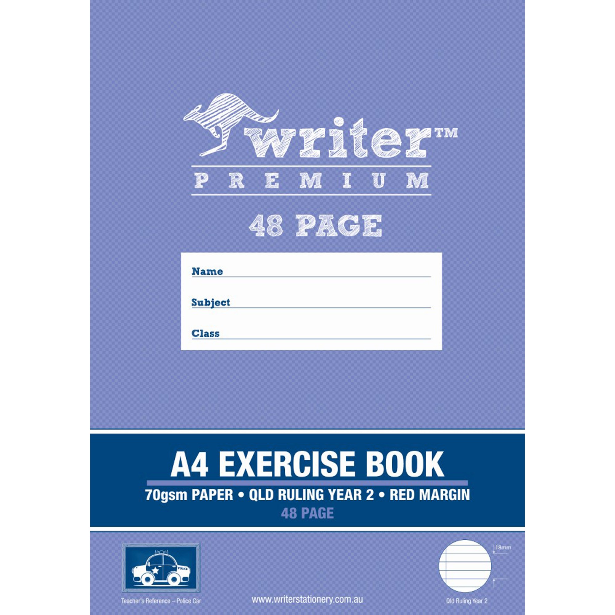 Writer Premium Exercise Books feature heavy duty covers, high quality white 70gsm paper with blue & red Queensland ruled lines and a red margin Unique cover colours and teachers references make each book easy to recognize Writer Premium Exercise Books also include an activity page, maths tables and conversion charts The Premium choice for all your school work Teachers reference is 'Police Car'.