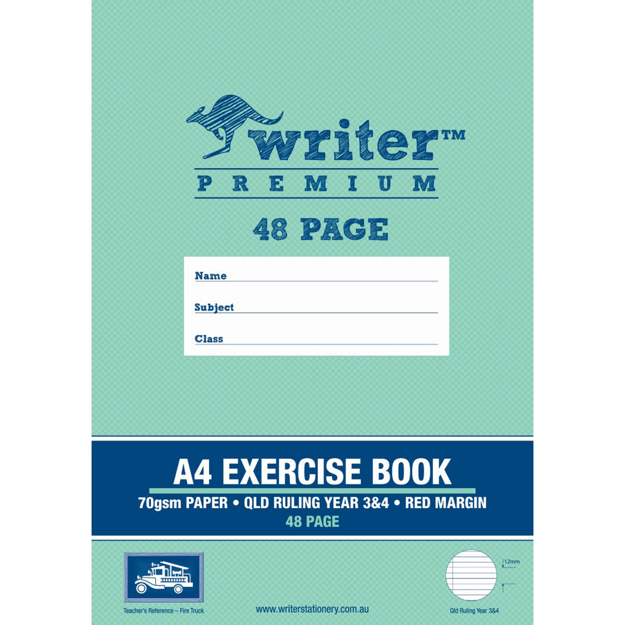 • Writer Premium Exercise Books feature heavy duty covers, high quality white 70gsm paper with blue & red Queensland ruled lines and a red margin