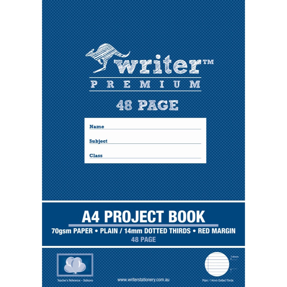 Writer premium exercise books feature heavy duty covers, high quality white 70gsm paper. 14mm dotted thirds on one page and plain on the other. Teachers reference Balloons.