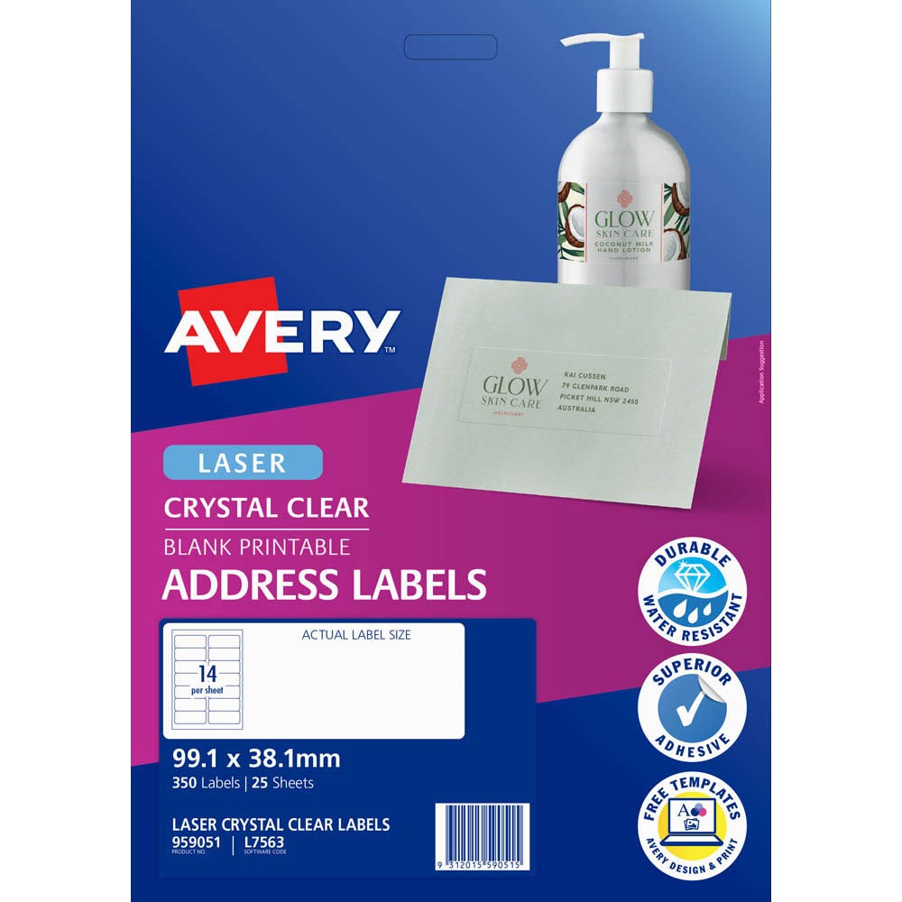 Premium glossy clear material is 100 percent transparent. Virtually disappear when applied to white and coloured surfaces. Jam-Free reliability for trouble free printing, saving time and minimising wastage. Ideal for envelopes, letters and product labelling. Made in Australia. Size: 99.1x38.1mm 350 labels, 25 sheets. 14 labels per sheet (14UP).