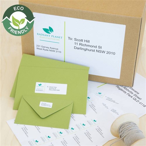 Environmentally friendly recycled material. Labels utilise water soluble eco-friendly adhesive. The packaging and label can be recycled. FSC certified labels made with paper from well-managed forests. This pack has 1300 labels in total, 65 UP, 20 Sheets.