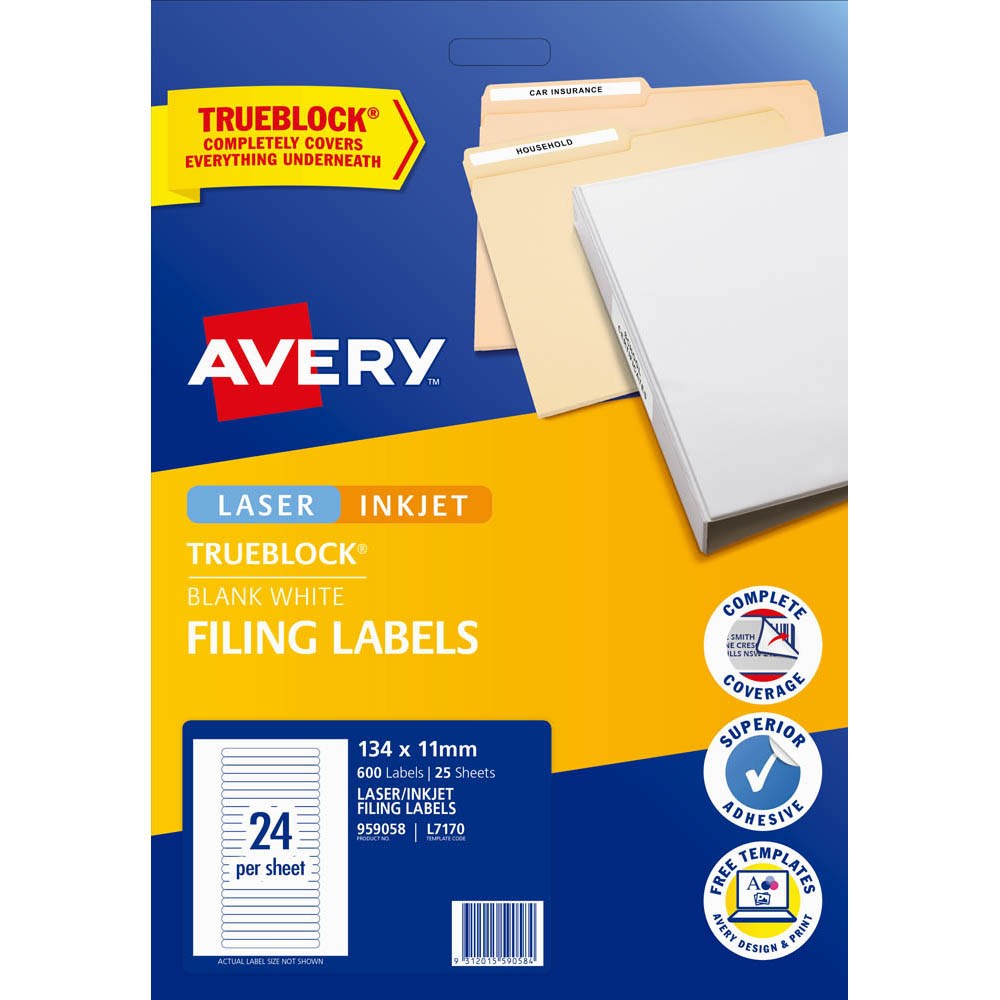 AVERY FILING LASER & INKJET LABELS WHITE L7170 134X11MM 24UP 600 LABELS 25 SHEETS