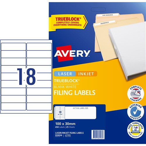 AVERY FILING LASER & INKJET LABELS WHITE L7172 100X30MM 18UP 450 LABELS 25 SHEETS
