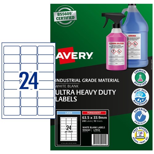 Ultra-Resistant Labels are saltwater resistant and certified for GHS Chemical Labelling with permanent adhesive and engineered to take on harsh environments. Unaffected by temperature variations -40?C to +150?C. Ideal for chemical labelling requirements and for onsite chemical decanting. Used in marine and harsh environments, ideal for safety signs, arc flash and tanks. Customise your labels with Avery Design and Print, available at averyproducts.com.au/print. Size: 63.5x33.9mm 240 labels, 10 sheets. 24 labels per sheet (24UP).