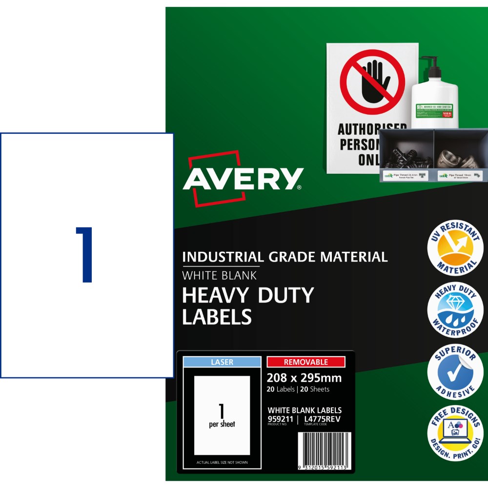AVERY IDENTIFICATION REMOVABLE HEAVY DUTY LASER WHITE L4775 208X295MM 1UP 20 LABELS