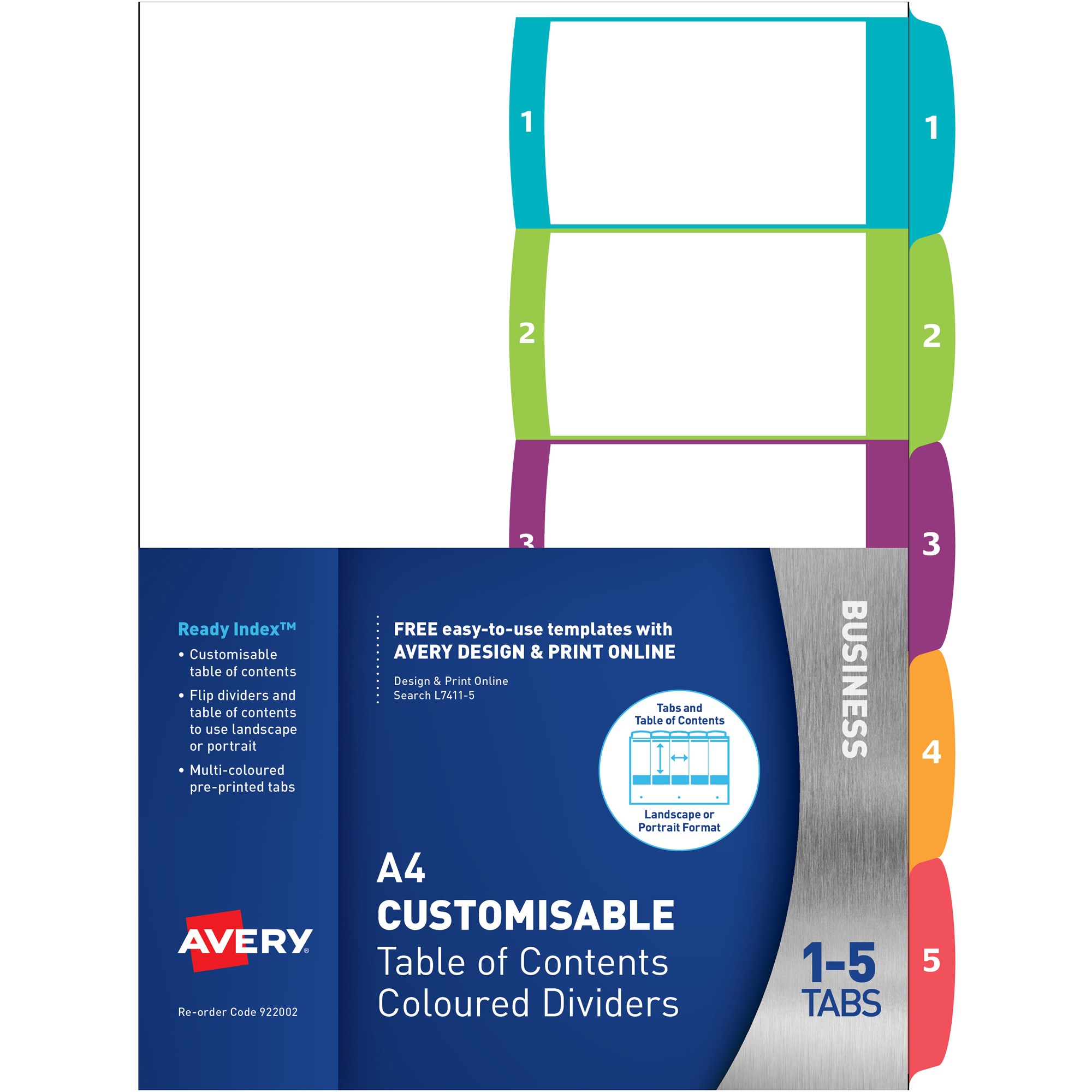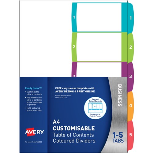 AVERY L7411-5 CUSTOMISABLE DIVIDERS A4 1-5 INDEX TABS BRIGHT ASSORTED