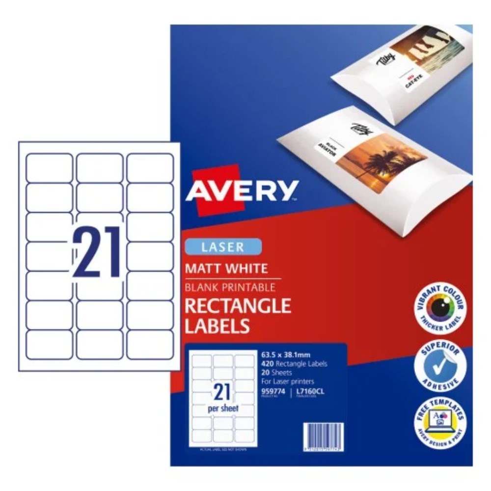 AVERY PRINTABLE LABELS L7160CL 63.5 X 38.1MM RECTANGLE PHOTO MATTE WHITE 21UP 420 LABELS